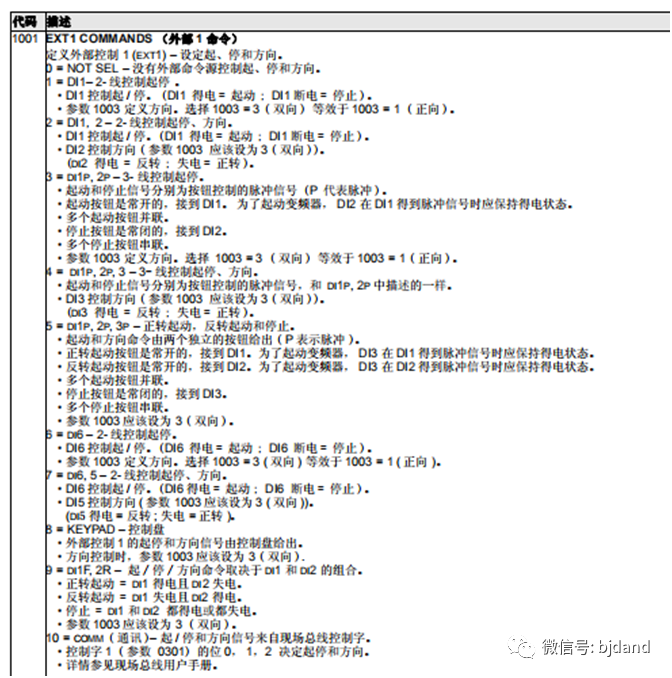 上述啟動/停止/方向的參數(shù)必須設(shè)置為:1001=DI1F.2R才能實(shí)現(xiàn)DI1正向啟動運(yùn)行,DI2反向啟動運(yùn)行,DI1/DI2狀態(tài)相同停車。參見下圖