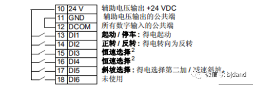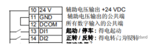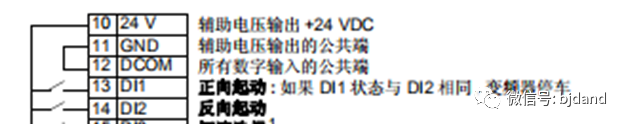 舉例3:如果變頻器的啟動/停止/方向控制信號接到13號(DI1)和14號(DI2),其中DI1作為正向啟動,DI2作為反向啟動.當(dāng)DI1置高電平后,變頻器啟動運(yùn)行一個方向。DI1置低電平后變頻器停止。當(dāng)DI2置高電平后,變頻器運(yùn)行另一個方向。DI2置低電平后變頻器停止。