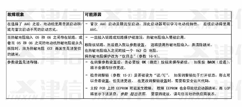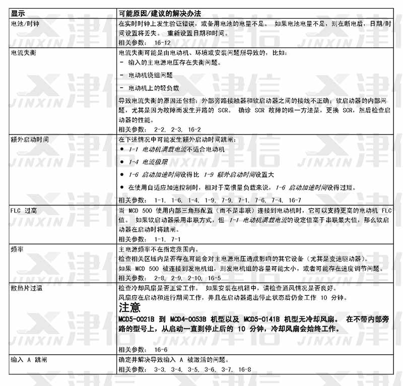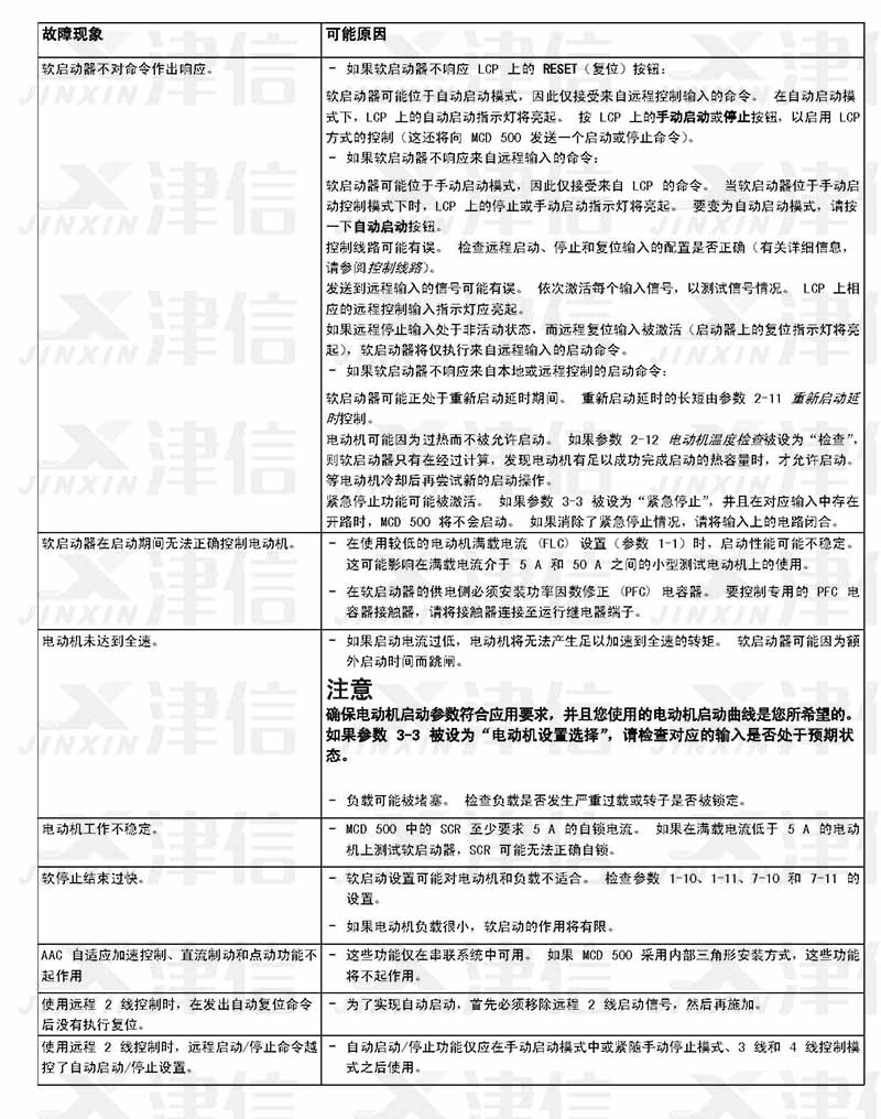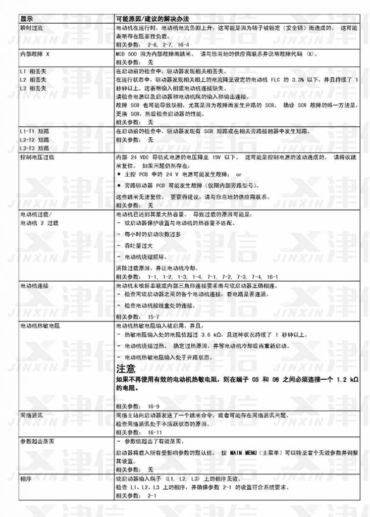 在軟啟動器使用過程中,如果偵測到故障信息,軟啟動器會在日志中記錄相關信息,還可能跳閘或發出警告。軟啟動器跳閘后,只有將該軟啟動器復位才能重新啟動。 如果發出警告,則一旦消除了警告原因,軟啟動器便會自動復位。