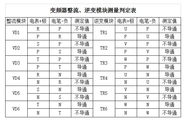 根據(jù)二極管和IGBT的單項(xiàng)導(dǎo)通性,將一支表筆搭接在直流母線正極P上,另一支表筆分別搭接在電源R、S、T上看導(dǎo)通情況,如果全通或者全不通則將表筆反過來測(cè)量應(yīng)全不通或者全通,此種情況說明整流模塊上半橋二極管完好。如果出現(xiàn)有的通有的不同時(shí)整流模塊損壞。同樣對(duì)于直流母線負(fù)極N和P極的測(cè)量方判定方法一樣。對(duì)于逆變模塊的測(cè)量和整流模塊一樣,只不過是將表筆搭接在輸出端子U、V、W上看通斷來判斷。