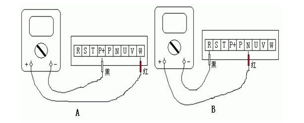 在通用變頻器的整流模塊輸入端子R、S、T及直流端子P、N上,用萬用表電阻檔測(cè)量如圖1變頻器主回路。