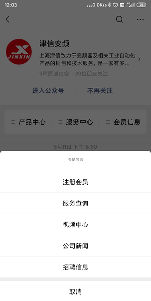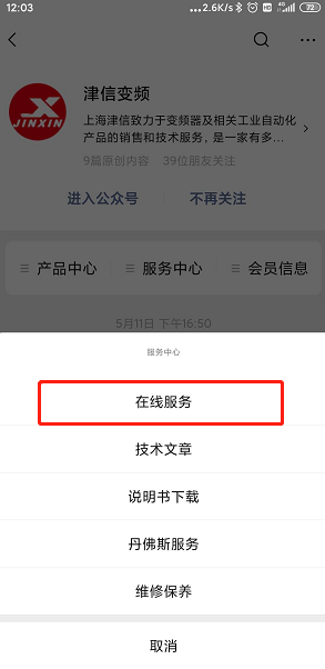 第一步,掃描二維碼,關(guān)注上海津信微信公眾號,公眾號包括產(chǎn)品中心,服務(wù)中心和會員信息三個主菜單。