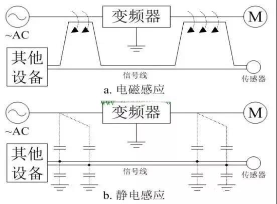 1、通用變頻器必須可靠接地,保證安全運(yùn)行并有效抑制電磁于擾。干擾如下圖: