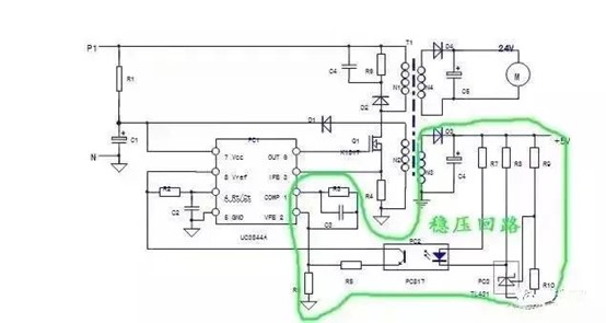- 對UC3844單獨上電,短接PC2輸入側,若電路起振,說明故障在PC2輸入側外圍電路;電路不起振則檢查輸出側電路。