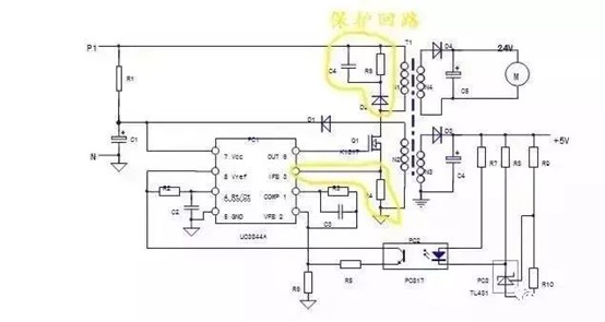 3、保護回路:PC1芯片本身和3腳外圍元件R4構成過電流保護回路;N1繞組上并聯的D2,R6,C4元件構成了開關管的反壓吸收保護電路;實質上穩壓回路的電壓反饋信號——穩壓信號,也可看作一路電壓保護信號,但保護電路的內容并不僅是局限于保護電路本身,保護電路的啟控往往是由于負載電路異常所引起的。