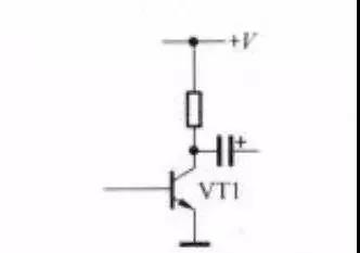 - T1基極上的元器件有三個方向:電源方向、地線方向、前級電路方向。下圖所示是電源+V方向的R1,地線方向上大多有電阻,前級方向上大多有耦合電容。