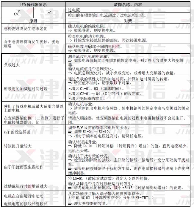 1. 自由運行中或急減速后,電機(jī)中還殘留有感應(yīng)電壓又重啟運行 2. 變頻器發(fā)生硬件故障 |