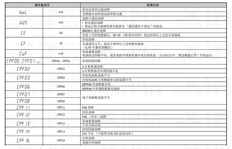 | CPF02 | 控制回路故障 | 變頻器發(fā)生硬件故障 | 重啟變頻器,確認(rèn)故障是否持續(xù);若故障持續(xù)發(fā)生,則更換電路板或變頻器。關(guān)于主板更換,請向本公司代理商或銷售負(fù)責(zé)人垂詢。(注:為了清除故障,需要進(jìn)行故障復(fù)位操作;無法進(jìn)行故障跟蹤) |